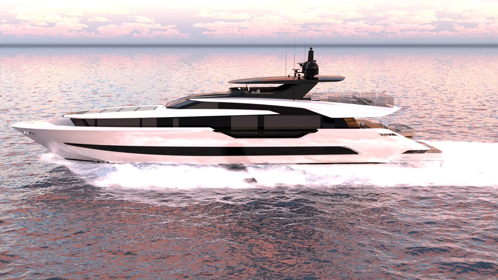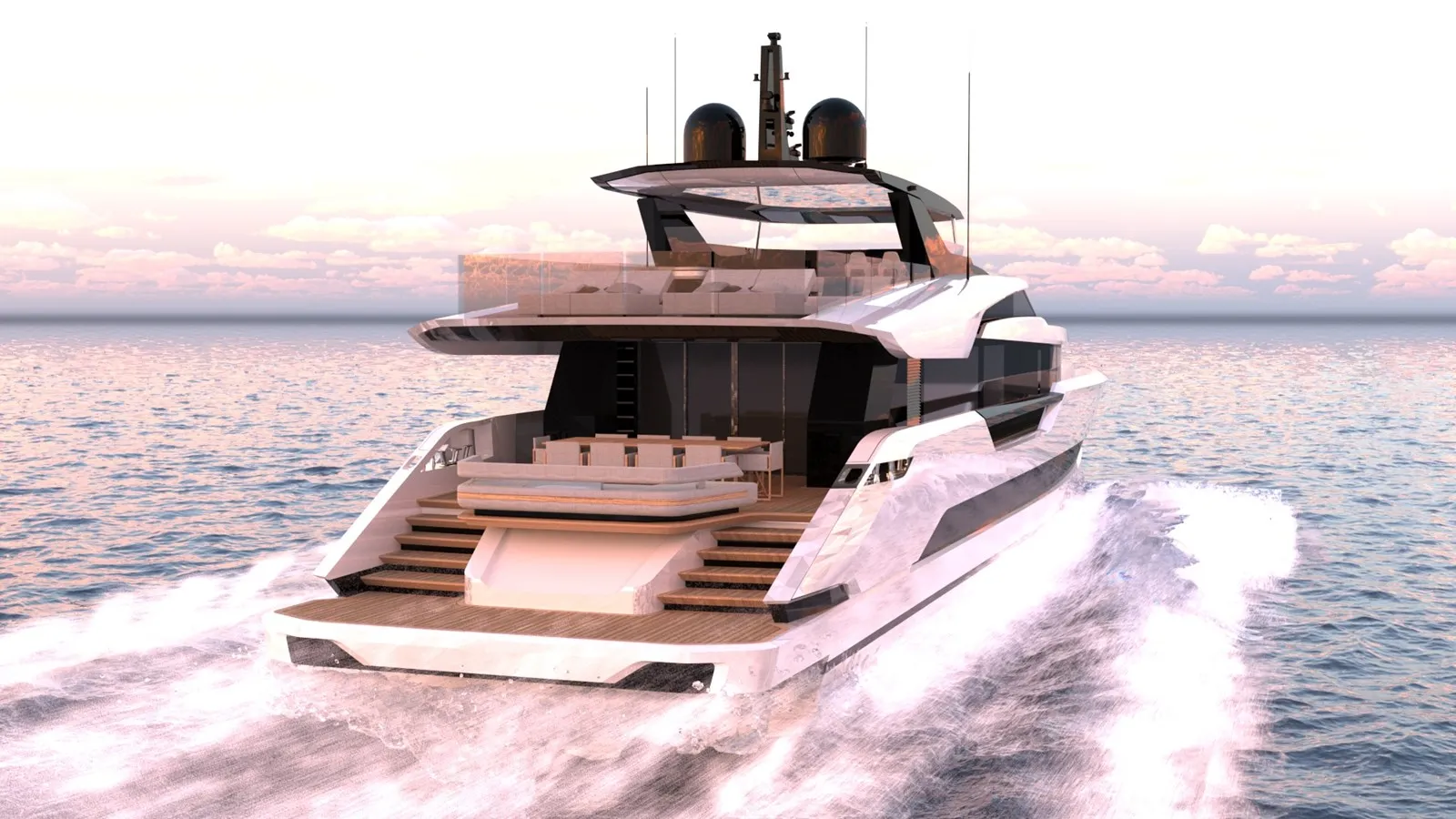 The exterior presents a streamlined silhouette with a polished hull surface that reflects the yacht’s focus on performance and presence; broad glazing and low, sculpted bulwarks preserve sightlines and an airy connection to the sea. Functional elements such as the expansive foredeck, integrated bathing platform and cleated cockpit flows are cleanly integrated into the profile so that operational practicality doesn’t interrupt the aesthetic. Attention to detail is evident in the metal finishes, flush fittings and custom railwork, creating a vessel that reads as both modern and thoughtfully engineered from every angle.